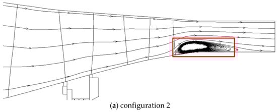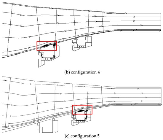 With the increase of labyrinth tip clearance, the overall performance of the compressor decreases. The compressor characteristics of each configuration are shown in Figure 9. It can be seen that, on the one hand, the change in labyrinth tip clearance causes flow rate change near the stall point of the compressor. This is due to the different leakage flow rate in the sealing cavity under different configurations, which makes the stall position of the compressor change. Figure 10 shows the streamlines at near-stall point for 3 different configurations. The minimum compressor inlet flow rate of the configuration 2 is close to that of the configuration 1. It is found in Figure 10 that in both configurations 1 and 2, compressor stall occurs at the root of the third stage stator (S3). When c1 increases to 0.5 mm (configurations 3 and 4), the flow rate near the stall point increases significantly, which means the stall margin decreases. At this time, in contrast to what happens in the first two configurations, the location where stall occurs first moves to the S1 root. It can be seen that when the seal cavity leakage flow increases to a certain extent, the flow field structure of S1 root is destroyed, and the compressor stall occurs ahead of time. With the increase of c2, the minimum flow rate increases further, and the stall starting point becomes S2 root (configurations 5 and 6).