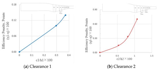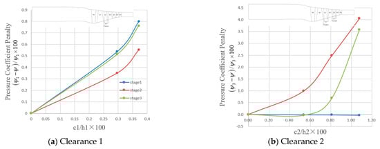 On the other hand, in a specific flow rate range, the compressor performance gradually decreases with the increase of the clearance. The same flow point of each configuration is selected for further analysis. For configurations 1 to 3, only the size of c1 changes, and the compressor performance of configuration 1 is taken as the benchmark. For configurations 3–6, only the size of c2 changes, and configuration 3 is taken as the benchmark. The variation trend of compressor efficiency attenuation with the tip clearance is obtained, as shown in Figure 11. It can be seen from this figure that for cavity 1, when the tip-to-span ratio (the ratio of tip clearance to stator blade height) increases by 1%, the compressor efficiency decreases by 0.4%; for cavity 2, the efficiency decreases by 0.6%, and as the gap continues to increase, the extent of efficiency decrease has an increasing trend. It is in the same order of magnitude as 1% efficiency decay in reference [].