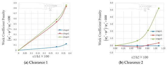 where Um is the tangential speed of the rotor at 50% of the span at the leading edge of the stage. Referring to the analysis method in Figure 11, configurations 1–3 are a group and configuration 1 is considered as a benchmark to study the effect of changes in c1 on the characteristics of each stage. Configurations 3–6 are another group and configuration 3 is considered as a benchmark to study the effect of changes in c2 on the characteristics of each stage. Figure 12 and Figure 13 show the variation of work coefficient attenuation and pressure coefficient attenuation with respect to tip clearance, respectively. From the first stage characteristic attenuation (blue line) of Figure 12b and Figure 13b, it can be seen that the leakage flow in the seal cavity 2 under the second stage stator has little effect on the performance of the first stage compressor. As it can be seen from Figure 12a, the leakage flow caused by the seal cavity 1 has little influence on the work capacity of the first stage (current stage), but has a relatively large impact on the latter two stages, thus reducing its work capacity. From Figure 12b, it can be concluded that seal cavity 2 has little effect on the work capacity of the current stage, almost no effect on the front stage (the first stage), and reduces the work capacity of the later stage (the third stage). On the other hand, as it can be seen from Figure 13, the seal cavity leakage flow has little effect on the pressurization capacity of the front stage (the change of cavity 2 in Figure 13b does not affect pressure coefficient of the first stage), but reduces the pressurization capacity of the current stage and the next one. Considering that the work capacity is mainly related to the rotor blades, and the pressurization capacity is affected by both the rotor and stator, the following conclusion can be drawn: Seal cavity leakage flow affects the performance of the stator row and the blade row located at downstream, but the impact on the upstream blade row (including the rotor blade row of the same stage and the more upstream blade row) is minimal. This conclusion will be further confirmed in the analysis of the spanwise distribution of the flow parameters of the blade row.