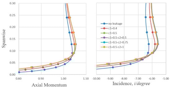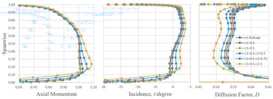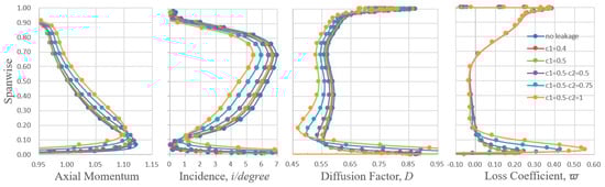 In order to further analyze the flow mechanism of the change of compressor stage characteristics caused by seal cavity leakage flow, the distribution of spanwise parameters reflecting the performance of blade row under different tip clearance conditions were analyzed and compared. Figure 14 shows the inlet axial momentum of the second stage stator S2 (normalized by the inlet axial momentum at the middle span of the second stage rotor when there is no gap leakage), incidence angle, diffusion factor and loss coefficient. The definition of diffusion factor D and loss coefficient and are as follows