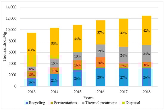 Until 2019, with the outbreak of the COVID-19 pandemic caused by SARS-CoV-2 virus, Poland had gradually increased the amount of selectively collected waste [3]. This is the basis for increasing the share of recycling and the waste stream returned to loop [3,4]. Unfortunately, coronavirus can disrupt this upward trend [4]. Current EU targets for recycling are: 55% by 2025, 60% by 2030 and 65% by 2035 [5]. Poland has a problem in fulfilling all obligations in this area. The COVID-19 pandemic will make the situation even more difficult. Figure 1 shows municipal solid waste in Poland in 2013–2018. There is a growing recycling tendency, but it is hard to fulfill the targets: