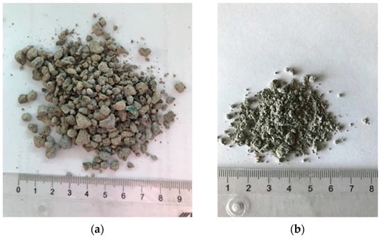 Two main secondary waste types are generated during incineration of municipal solid waste: hazardous fly ash and non-hazardous slag. The fly ash in Waste Catalogue is classified under the code 19 01 07* (* means that this is hazardous waste.)—solid waste from gas treatment and slag is under the code 19 01 12—slags and bottom ash [30] (different than hazardous) [34,35]. The fly ash is light gray and it has a very fine fraction (specific surface area 745 m2/kg). It is very hygroscopic and dusty with an acrid smell. The slag is gray with visible glass particles. The slag is similar to aggregate, while the fly ash is similar to cement. Figure 4 shows slag (Figure 4a) and fly ash (Figure 4b).
