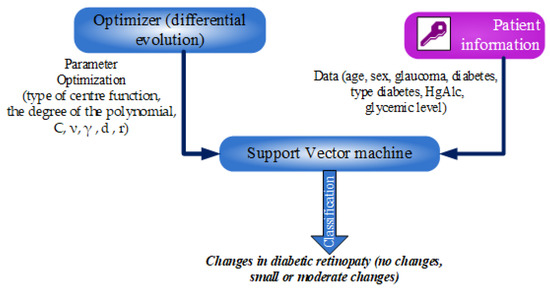 The work flow of information between the database (which contains the patient information), DE and SVM is presented in Figure 1. The model, SVM, has as inputs a series of information related to the patients with DR. Parameters in SVM, that can have significant influence on the result accuracy, are optimized with DE. Consequently, the results in classification—changes or no changes in diabetic retinopathy—are provided by a model in optimal form.