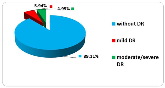 The study was performed on a sample of 52 patients: more particularly, 101 eyes with POAG + DM; and the effectiveness of the classification algorithm in assessing retinal changes related to diabetes is proven. The mean age was 64.9 ± 7.06 (between 48 and 74 years old). The distribution by age groups highlights the fact that the most increased frequency of patients with diabetic retinopathy changes can be found in the age group 70–79 years (50%), while for other patients, the frequency peak is reached in the group 60–69 years (47.2%) (Chi-square distribution = 41.93; degrees of freedom—df = 3; probability—p = 0.001). From all studied eyes, 72 eyes (71.28%) had POAG, 21 eyes (20.8%) had OHT and 8 eyes (7.92%) had normal tension glaucoma (NTG). Among patients with diabetes mellitus, 30 had DM type II, 5 had DM type I and 16 with insulin—dependent DM type II (Table 1). Among patients with diabetic retinopathy changes, the age of glaucoma was significantly increased in comparison with the control group (5.67 vs. 3.97 years; p = 0.049). In the studied cases, patients with diabetic retinopathy were predominant along with patients with glaucoma for 5–10 years (50%), out of which 1/3 were men and 1/3 aged over 65 years (p = 0.001). Regarding the changes in diabetic retinopathy, 5.94% had mild changes, 4.95% had moderate/severe DR and the rest (89.11%) did not show any changes (Figure 2).