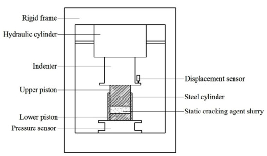The test system for the axial-output method is shown in Figure 1, which mainly consists of two parts: the steel cylinder and the automatic load control system for axial confinement, and axial stress measurement. This method constrains the radial displacement so that the displacement occurs in the axial direction. The piston diameter is 0.2 mm smaller than the cylinder diameter, so that a small gap can be maintained between them and the piston can move freely along the axial direction. The main role of the piston is to seal the SCA slurry in the cylinder, so that the axial restraint can be applied. When the SCA slurry generates expansive pressures in the cylinder, the axial force can be transferred evenly to the load measurement device. The automatic load control system is composed of two parts: the servo-controlled loading machine and the automatic control software. The testing machine can achieve a maximum load of 3000 kN. The precision of the load cell is 0.5 kN. Taking the cylinder with a diameter of 113 mm as an example, the measurement precision can reach 0.01 MPa. The displacement was measured by an external small-deformation displacement sensor, with the maximum range of 5 mm and the precision of 0.0001 mm, which can fully satisfy the test requirements. The axial pressure was calculated by dividing the load cell record by the piston area. With the temperature measured by the gauge on the exterior cylinder wall, the circumferential strain was compensated. The axial pressure can then be obtained theoretically according to the cylinder stress theory in elastic mechanics.