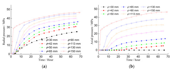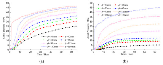 Figure 2 presents the time histories of radial and axial pressures corresponding to various cylinder diameters. The results indicate that: for any cylinder diameter, the radial and axial pressures increase first and then tend to be steady with time and increase with increasing cylinder diameter. Due to the boundary effect, the ratio between the radial and axial pressures increases with increasing cylinder diameter. Taking the data within 65 h as an example, the ratio gradually changes from 0.3 to 1.
