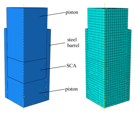In order to back analyze the mechanical parameters of SCA, a finite element model (1/4 model) is established according to the geometric parameters of steel cylinder and SCA, as shown in Figure 3. The contact relations between the steel cylinder and SCA, piston and SCA are face-to-face smooth contact, and the mean value of the static friction coefficient between the steel cylinder and SCA was determined experimentally as 0.3. It is assumed that there is no relative displacement at the contact surface between the steel cylinder and the SCA. The steel cylinder and SCA are discretized by 8-node hexahedral elements and 20-node hexahedral elements. Both symmetry surfaces are constrained symmetrically, i.e., the out-of-plane displacements and out-of-plane rotation are constrained. The vertical displacement of the bottom of the steel cylinder, the upper and lower pistons are constrained. The elastic modulus and Poisson’s ratio of steel cylinder and piston are set as E = 205 GPa and μ = 0.3. During numerical simulation, thermal expansion is adopted to simulate the volume expansion during the hydration process of SCA.