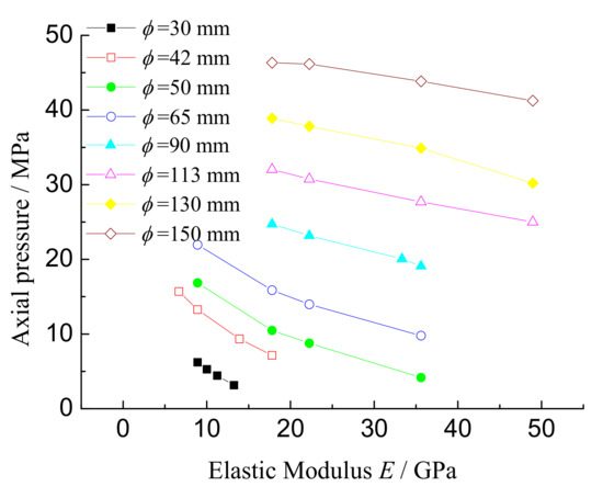 The above numerical results indicate that in models with smaller cylinder diameter, the effect of axial expansive pressure on selection of elastic modulus is trivial, while the effect is more prominent for models with larger cylinder diameter. The errors in axial expansive pressures obtained by physical tests are amplified for determination of elastic modulus. The amplification factor increase with increasing diameter. The analysis shows that: for the models with larger cylinder diameter (ϕ ≥ 113 mm), the elastic modulus varies in a larger range, which is caused by the amplified errors in the measured axial expansive pressures. In consideration of the general mechanical performance of elastic body, the elastic modulus for models with large cylinder diameter is adjusted appropriately. The elastic modulus is considered to be stable when the diameter is greater than 90 mm, as shown by the fitting curve in Figure 7.