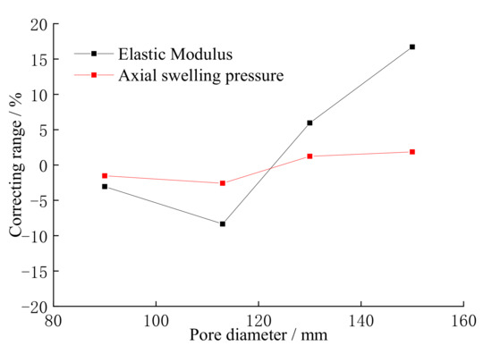 First, error analysis is performed for the elastic modulus before and after fitting. Meanwhile, according to the fitted elastic modulus curve, the axial expansive pressure corresponding to a cylinder diameter of 90, 113, 130 and 150 mm, respectively, is determined. The errors are analyzed by comparing with the axial expansive pressure corresponding to the elastic modulus before adjustment. For four models with various cylinder diameters, the elastic modulus error varies in a large range. When the diameter is 150 mm, the error in elastic modulus reaches 16.7%. However, the corresponding axial expansive pressure error varies in a small range, with the maximum being less than 2.0%. Therefore, it is shown that, when the elastic modulus after adjustment is adopted for numerical simulation, the error in the axial expansive pressure is relatively small, as shown in Figure 8.