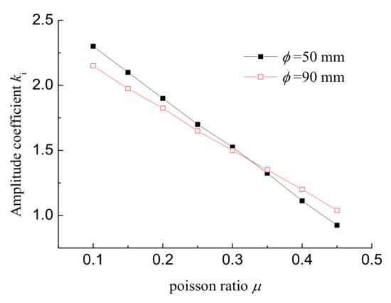 The elastic modulus corresponding to various diameters is selected. When the other parameters remain unchanged, the Poisson’s ratio μ of the SCA model is varied so as to simulate the effect of Poisson’s ratio. The simulation results show that the axial expansive pressure increases linearly with the Poisson’s ratio. In order to keep the simulated radial expansive pressure consistent with the measured data, the amplitude coefficient ki for temperature increase needs to be adjusted. The amplitude coefficient ki after adjustment decreases linearly with increasing Poisson’s ratio. Taking the simulation results for models with cylinder diameter of 50 and 90 mm for example, the relationships between Poisson’s ratio and the amplitude coefficient are shown in Figure 9.