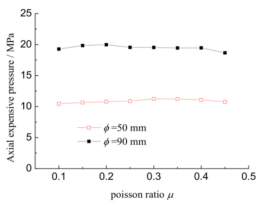 Based on the above simulation results, the axial expansive pressures corresponding to various Poisson’s ratios are compared. Given the simulated radial expansive pressures being consistent with the measured values, the relationships between Poisson’s ratio and the axial expansive pressure for models with cylinder diameter of 50 mm and 90 mm are plotted in Figure 10. It can be seen that the Poisson’s ratio has little impact on the axial pressure, which is almost constant. In another word, the ratio between the axial and radial pressure is independent of Poisson’s ratio.
