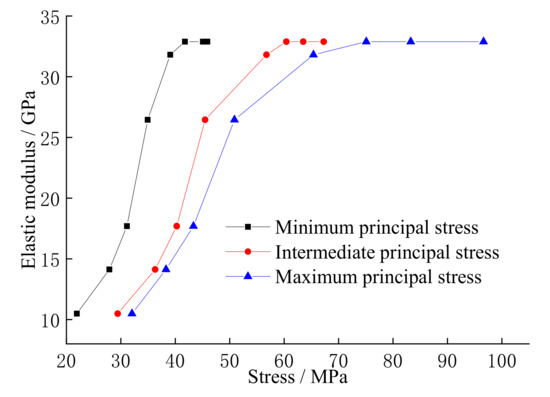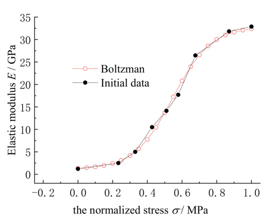 In the following section, the relationship between the stress and elastic modulus will be established according to the major principal stress. The major principal stress in Figure 11 is normalized. As the maximum principal stress is 95.09 MPa, the two stresses higher than 75.09 MPa are ignored for normalization. The elastic modulus and the normalized stress are shown in Table 2, which is the model for variation of elastic modulus with the major principal stress.