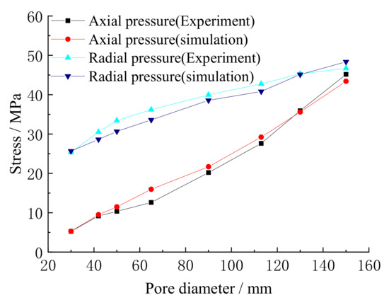 It is known from the previous studies that the expansion pressure of SCA ranged from 20–70 MPa [7,23,24,27,28]. Similar to the results of previous studies, the axial and radial expansion pressure of SCA reached about 48 MPa in this study. Meanwhile, both model experiments and numerical experimental results show that the expansion pressure gradually increases with increasing diameter, which is consistent with the results of [23,24]. By increasing the diameter of SCA, a higher expansion pressure can be obtained. However, it should be noted that the relationship between the expansion pressure and diameter of SCA is not linear.