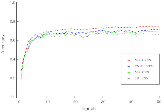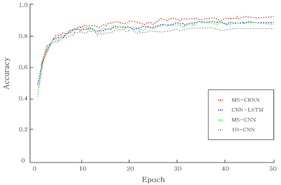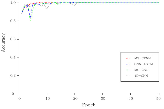 To evaluate the performance of the proposed model, we evaluated it using 1D-CNN, MS-CNN, CNN-LSTM, and MS-CRNN algorithms. Each experiment showed a result of 50 epoch and was repeated more than 10 times. All experiments used the most important accuracy mentioned in the evaluation indicator, and the F-1 score was used to compensate for the shortcomings in accuracy. For an accurate experiment, a total of three experiments were conducted.