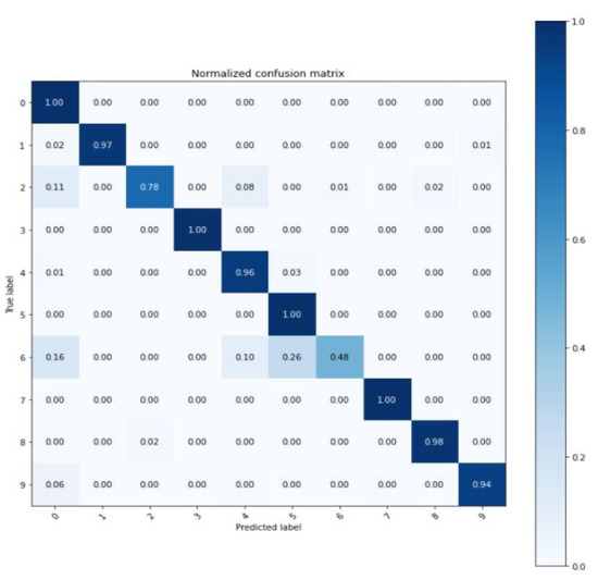 Figure 11 shows the results of the confusion matrix for the proposed model. By removing the noise and classifying the defect, we see that most of the time, we classified the defect with a high probability. However, as shown in Figure 10, even when the noise was removed through the DAE and the experiment was conducted, all defects could not be classified well.