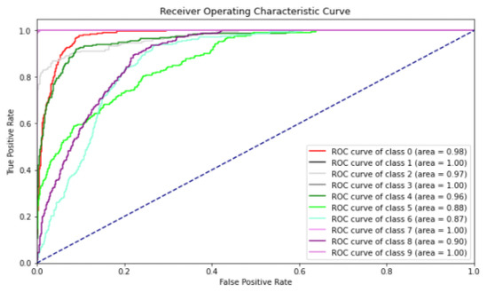 Figure 12 shows the evaluation of the model using the ROC curve. Each class of the ROC curve was the same as that of Class Num in Table 3. The closer the ROC curve area is to a value of 1, the better the model performance. As is evident from the ROC curve, we achieved an area of 0.9 or more in most classes.