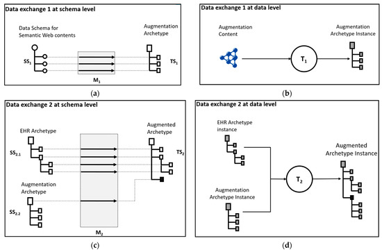 The first data exchange problem is to normalize the augmentation content. This is defined at the schema level by the tuple <[SS1], TS1, M1>, where SS1, the data schema for Semantic Web contents, is a canonical representation of the augmentation content expressed in Semantic Web format. TS1, the augmentation archetype, is a canonical form of the augmentation content expressed in EHR archetypes. Finally, M1 is the specification of relationships between elements in SS1 and elements in TS1. At the data level, the transformation T1 is an implementation of M1 intended to normalize the augmentation content into an EHR extract by converting instances of [SS1] into instances of TS1.