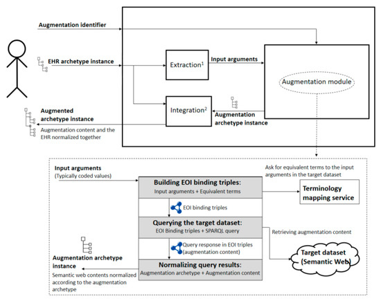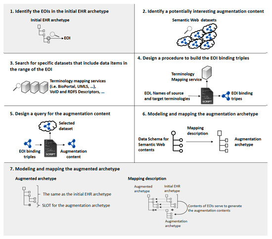 The aim is to enrich EHR extracts with data drawn from heterogeneous semantically rich information sources. To achieve a widely applicable solution, the starting points are: (i) EHR instances normalized according to a set of EHR archetypes (i.e., ISO13606 or OpenEHR archetypes), and (ii) augmentation content expressed in Semantic Web format (usually structured and stored as RDF datasets). Next, another set of EHR archetypes (hereinafter augmentation archetypes), modelled specifically to represent the augmentation content as normalized EHR extracts, allow homogenization of the format of the augmentation content and the initial EHR extract. A last EHR archetype called augmented archetype, which comprises the initial EHR archetype and augmentation archetypes, allows a seamless integration of the initial EHR extract and the augmentation content into the augmented EHR. Note that the augmented archetype may contain one or more augmentation archetypes. For coherency reasons, the structure of the augmentation archetype will be determined by the one of the initial EHR archetype.