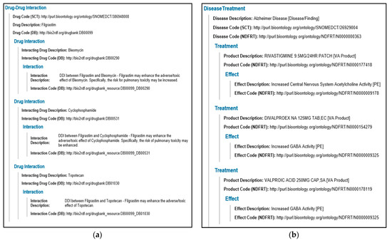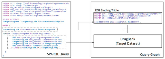 The EOI binding triples are injected at runtime in a SPARQL query as part of the query graph to collect the augmentation content. Figure 11 shows the SPARQL queries for the EHR augmentations’ drug–drug interactions and disease-related treatments.