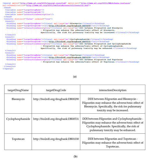 The execution of this SPARQL query provides the drug–drug interactions for Filgrastim. Figure 5 shows the results formatted according to the W3C schema for query results. Note that the variables in the SELECT clause of the SPARQL query (Figure 4) appear in the augmentation content (Figure 5).