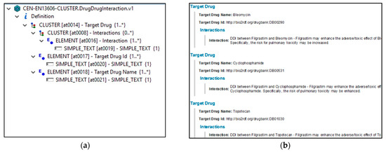 (a) A LinkEHR visualization of the augmentation archetype CEN-EN13606-CLUSTER.DrugDrugInteraction.v1 for drug–drug interactions of the example in section D. (b) an instance of the CEN-EN13606-CLUSTER.DrugDrugInteraction.v1 augmentation archetype presented in HTML and holding drug–drug interactions for Filgrastim (i.e., the augmentation content resulting from the example in section C).