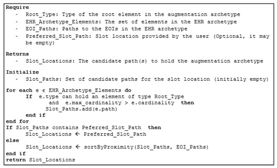 To assist in the process of choosing the proper slot location for the augmentation archetype, this work introduces an algorithm (Figure 7) to identify which components of the initial EHR archetype are valid to contain the slot reference. The result of this algorithm is a set of candidate paths ordered by proximity to the EOIs in the initial EHR archetype: