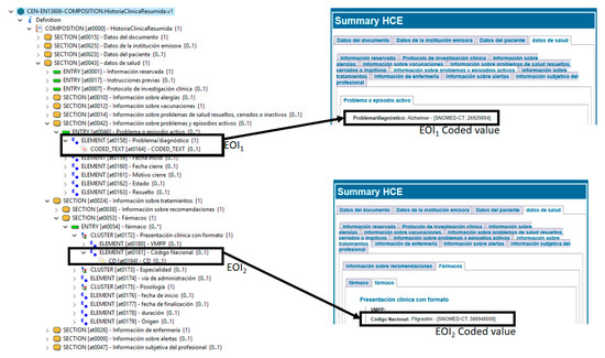The EOIs selected from the summary EHR archetype are patients’ active medication and active episodes of patients’ diseases, located at paths