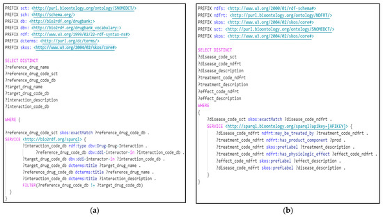 SPARQL queries to obtain the augmentation contents. (a) The query to collect the drug–drug interactions. This retrieves interaction descriptions, codes, and names of the drugs involved in each drug–drug interaction. (b) The query to retrieve disease-related treatments. This obtains treatments and descriptions related to a given disease. In both cases, queries are parametrized using the EOI binding triples as part of the query graph, and the skos:exactMatch predicate allows filtering the augmentation content by retrieving only the information related to the coded values of the EOI binding triples.