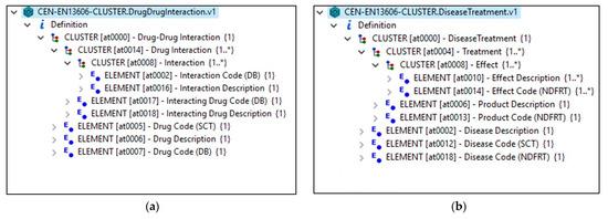 Augmentation archetypes’ visualization from LinkEHR. (a) The CEN-EN13606-CLUSTER. DrugDrugInteraction.v1 augmentation archetype for the drug–drug interactions EHR augmentation. (b) The CEN-EN13606-CLUSTER.DiseaseTreatment.v1 augmentation archetype for the disease-related treatments’ EHR augmentation.