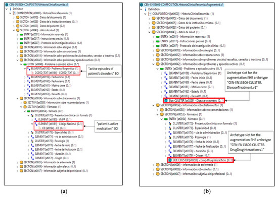 Archetypes’ visualization from LinkEHR. (a) The initial EHR archetype CEN-EN13606-COMPOSITION.HistoriaClinicaResumida.v1. The EOIs used in this use case are highlighted. (b) The augmented archetype CEN-EN13606-COMPOSITION.HistoriaClinicaResumidaAugmented.v1, which is similar to the initial EHR archetype but includes archetype slots for the augmentation archetypes.
