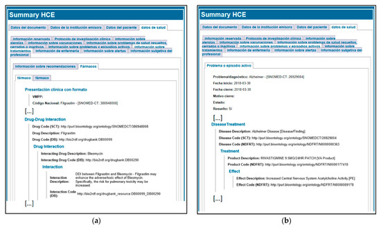 An HTML representation of the augmented summary EHR extract, an instance of the augmented archetype CEN-EN13606-COMPOSITION.HistoriaClinicaResumidaAugmented.v1 including the augmented content from (a) drug–drug interactions’ and (b) disease-related treatments’ EHR augmentations.