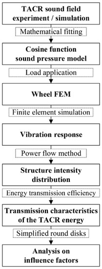 In this paper, a mathematically fitting load model arising from TACR energy acting on the rim is put forward, which is first based on experimental and simulation results. The power flow method is applied to calculate the resonance energy transmission characteristics in different aluminum alloy wheels. Then, the effects of structure damping and the wheel spoke number are also studied. The path of this work’s technique is shown in Figure 1. These works may help further design the wheel structure to reduce the propagation of TACR energy into the cabin.