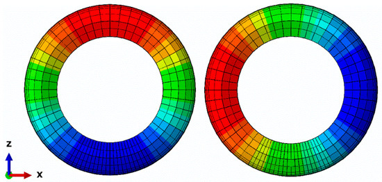 In order to simulate TACR conditions, modal analysis of the tire acoustic cavity was carried out first. The free acoustic modal shapes were obtained in the case of a 2.5 bar inflation pressure, as shown in Figure 3. The two modes differed from each other in the circumferential direction (90 degrees) but belonged to the same natural frequency of 237 Hz.