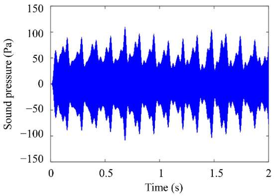 The angular position of the sound pressure sensor was determined based on its time history data, obtained by the wheel angle sensor. Then, with both the pressure data and angular position data, the sound cavity pressure distribution could be processed. The test equipment is shown in Figure 6. In the case of the 2.2 bar inflation pressure and the vehicle speed being 50 km/h, the time history of the sound pressure in the tire cavity resulting from TACR is shown in Figure 7. It was the bandpass filtering for the original signal in a range of 210–260 Hz which covered the first natural frequency of the tire’s acoustic cavity. From the plot, it can be seen that the period of the curve was 0.14 s, and the highest sound pressure was about 100 Pa. The in the load model could be determined by the experimental test results.