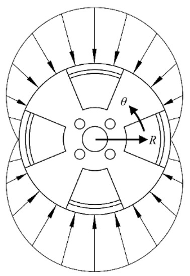 Direct-solution steady state dynamic analysis was applied to analyze the vibration response and structure intensity distribution of the wheels under TACR excitation. The vibration energy generated by TACR first impacted the wheel rim, then the wheel spokes, and then went through the bolts at the hub into the suspension system, and how this energy propagated in the wheels was focused on in this work. The cylindrical coordinate with the wheel center as the origin was used for analysis. As Figure 10 shows, along the spoke is the R direction, and along the rim circumference is the θ direction.