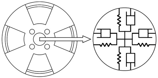 Considering the TACR energy transmission path, simulation of the connection between the wheel and suspension system at the hub was required. The radial spring and damping were added in the center of the hub to simulate the stiffness and damping of the suspension system. All freedoms of the bolts were constrained except the R direction in the cylindrical coordinate system, and the radial springs were set to simulate the action of the suspension system on the wheel, since the force from sound pressure in the cavity resulting from the acoustic cavity resonance was normal to the surface of the rim; that is, it was normal along the R direction. The four parallel spring dampers with uniform circumferential distribution were set as shown in the Figure 11.