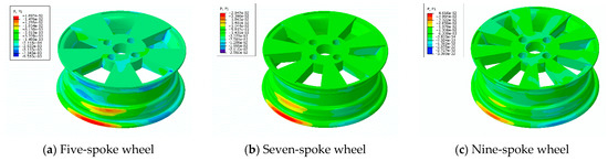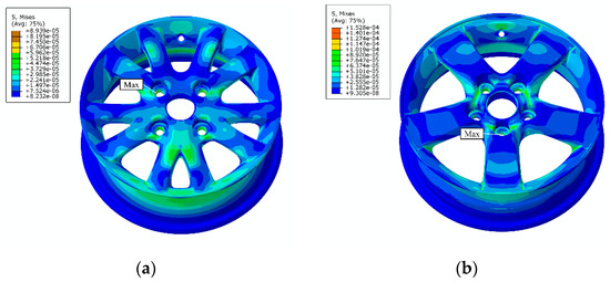 Stress distributions of the two wheels: (a) 14-inch wheel and (b) 15-inch wheel.