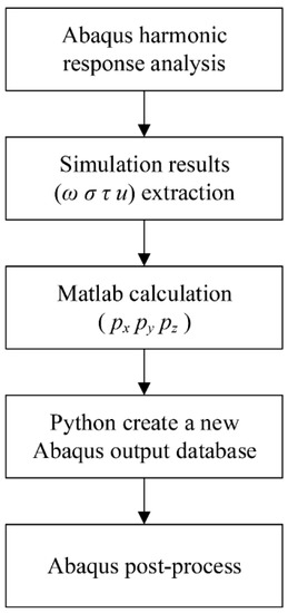 where , and indicate the structure intensity in the x, y and z directions, respectively; ω is the circular frequency; and , and indicate the complex conjugate of velocities in the x, y and z directions, respectively. According to the results of the finite element simulation in Figure 12, the complex stress and displacement distributions under TACR frequency excitation were obtained. To calculate the structure intensity of each node of the FEMs, an in-house code including Matlab and Python scripts was developed. The flow chart of the calculation process was as given in Figure 14.