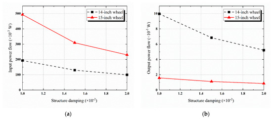 Structure damping is a parameter reflecting the energy dissipation in the vibration process, the effect of which on TACR energy transmission is studied in this section. Aluminum alloy wheel structure damping generally varies from 1% to 2%; thus, the structure damping was set to be 0.01, 0.015 or 0.02 in the simulation, while other parameters remained constant. The input and output power flow calculation results in the two sizes of wheels are shown in Figure 17.