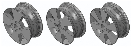 Based on the test results, two FEMs of the 14- and 15-inch aluminum alloy wheels were constructed. Taking the 14-inch wheel as an example, the type of the wheel was 5.5 J × 15. The material of the wheel was cast A356-T6 aluminum alloy, and the density, Young’s modulus and Poisson’s ratio were 2.7 × 103 kg/m3, 72 GPa and 0.3, respectively. The element type was C3D10, and the numbers of elements and nodes in the wheel’s FEM were 117,905 and 202,448, respectively. The comparison between the finite element simulation and the experiment test results is shown in Table 2. Both the first three natural frequencies and the modal shapes were highly consistent, which verifies the validity of the wheel FEMs.