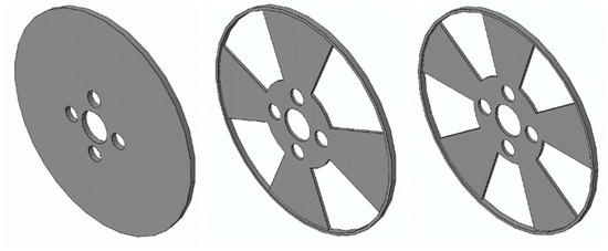To know how the power flow propagated in the wheels and clarify the influence mechanism of the spoke number, the simplified round disk models (RDMs) without and with spokes of different numbers were constructed as shown in Figure 21. The RDMs with a 10 mm thickness had the same cross-section shape as the simplified wheel in Figure 20, which was used to analyze the influence of the spoke number on the power flow transmission. Vector graphs of their structure intensities under the same sound pressure excitation are shown in Figure 22.
