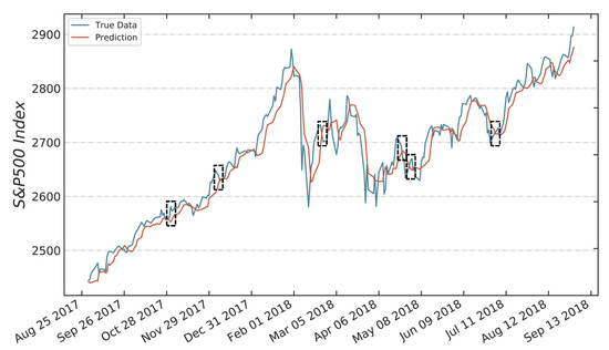 Due to the remarkable result of deep learning in various domains such as computer vision [29], natural language processing [30], and network security [31]. In recent years, many methods based on deep learning have been proposed to forecast stock prices and have drawn some essential conclusions [32]. Nevertheless, when applying these methods to the development of trading systems, a common phenomenon occurs: the prediction price turns out to be a very much delayed version of the price from a time step before, as shown in Figure 1. It seems that the point-by-point prediction closely matches the real price curve, but in fact, this is deceptive, and the prediction tends to simply repeat the trajectory of historical prices with a delay. The delay occurs because the predicted price is close to the last time step of the input stock price sequence. After training for many iterations with an MSE loss function, the LSTM model tends to output a value close to the last time step of the input sequence as the predicted stock price of the next time step in order to minimize the MSE loss. From the figure, we can see that the prediction results in the gray dotted boxes moving in the opposite direction to reality, which is the lagging phenomenon that causes a poor prediction performance.