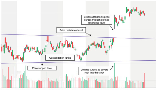 It is obvious that high-margin trading points are more important to investment returns than trivial trading points because of the considerable transaction costs. In fact, the trading range breakout (TRB) trading rule that is widely used by active investors [52,53,54,55] is indeed a trading strategy that focuses on high-margin opportunities. Based on the practical experience of human investors, the breakout point is an important trading point that is more likely to be a high-margin opportunity. As shown in Figure 2, a breakout occurs when a stock price rises above a specified resistance level as the trading volume increases. Human traders usually enter a long position after the stock price breaks above resistance. Once a stock trade moves above a price barrier, volatility tends to increase, and prices usually move in the direction of a breakout. Breakouts are important because they are the starting points for large future price movements and, in many cases, major price trends. Usually, the most explosive price fluctuations are the result of channel breakthroughs and price breakthroughs, such as triangles, flags, and heads and shoulders. Volatility shrinks within these time frames, and it usually expands after the price exceeds a certain range. Compared to slight price fluctuations, which are similar to a random walk process, the temporal pattern before such breakout points is more likely to be caused by the inherent law of price and volume movements. Several studies have provided empirical evidence for the trading range breakout (TRB) rule, showing that it has significant predictive power and is able to generate profits in a manner superior to a simple buy-and-hold plan [52,53]. Consequently, this study labels breakout points as important trading points with a formula. In this way, the RNN can be utilized to learn the underlying patterns of breakouts to identify potential high-margin opportunities.