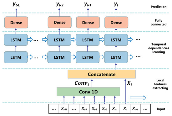 The forecasting of stock performance is affected by both long-term temporal dependencies and local fluctuation features. Due to its memory blocks, the LSTM network has a strong capability of capturing the long-term memory of sequential data with a high prediction capacity for chaotic time series. Thus, we adopt LSTM to learn long-term temporal dependencies from stock data time series. The overall structure of our proposed model is shown in Figure 4. Unlike the common methods that use a “many-to-one” model with a sliding window of a fixed size of preceding data, this work adopts the “many-to-many” model; i.e., the overall historical time series is input into the model from the beginning to time T , and the prediction value is the output at each time step . The reason is that LSTM has the capacity to maintain long-term dependencies between the input time steps because of the memory state; thus, there is no need to preprocess the past data in a time window, as required with other classification models such as the support vector machine (SVM) and MLP [15]. In fact, preprocessing the past data in a time window with a fixed size damages the raw temporal sequence information because the information before the time window is discarded, which could even decrease the prediction accuracy. In addition, one-dimensional convolution (Conv 1D) is introduced to extract local fluctuation features, which can help to enhance the prediction performance. This particular neural network learns filters to study the mapping relationship between any input and output from the training on known patterns. The formula for forward propagation in the model is as follows: