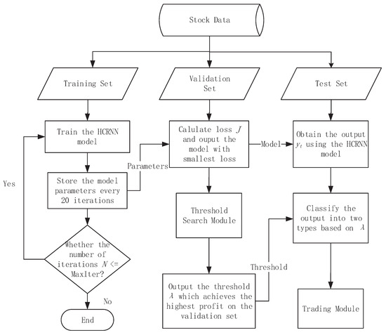 With the proposed HCRNN model, the prediction of important trading points is straightforward. Figure 5 depicts the flow chart of the proposed framework, which consists of three parts: