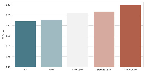 To provide an insight into the prediction performance of different models, the classification results of all the models are shown in Figure 6, in which each bar indicates the average F1 score of the testing datasets. It can be seen that the proposed HCRNN model is able to achieve the best classification result among all the baseline models because the HCRNN takes both long-term temporal dependencies and local fluctuation features into consideration, which enhances the prediction ability of the model.