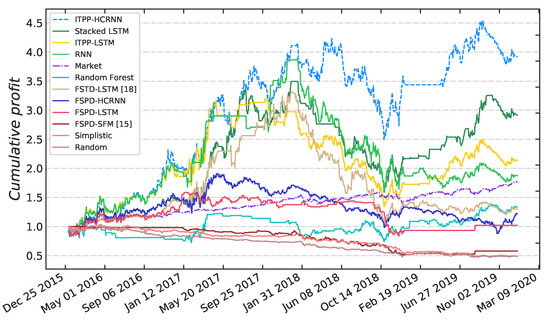 where represents the return of the portfolio, is the risk-free rate—we use 3% as the estimate of —and denotes the standard deviation of the portfolio’s excess return. The comparison results of each method are listed in Table 4. In addition, the cumulative profit curves of the different methods are plotted over four years, as shown in Figure 7. It is shown that the proposed important trading point prediction framework based on our HCRNN model is able to obtain the highest profit with relatively low risk. The detailed comparison and analysis of each method are presented in the next subsection.