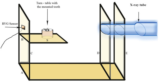 A standard plywood jig (Figure 1) was designed in the following manner. It consists of two flat horizontal, parallel stacks (A and B) and three vertical stakes (C, D and E) made of plywood projecting from the horizontal one. The upper horizontal stake was short and fitted with a turn table which was eight inches from the X-ray tube and can be rotated to 360 degrees. The angle of rotation can be checked with an angle measuring scale (S) fitted on the surface of the turn table. The tooth for which the measurement to be carried out was mounted over the turn table. In the vertical stakes on one side, vents were made, and X-ray tube was fitted so that the tube can pass through the stakes and firm in position. Digital sensor from Radio Visio Graphy equipment was fixed on the backside of the stake in an ideal manner so that the X-ray can pass through the tooth mounted over the turn table and reach the sensor in a parallel direction.