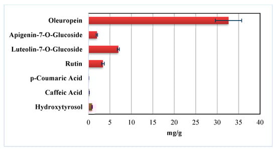Bar graph showing the content (mg/g) of different phenolic compounds detected in OLE.