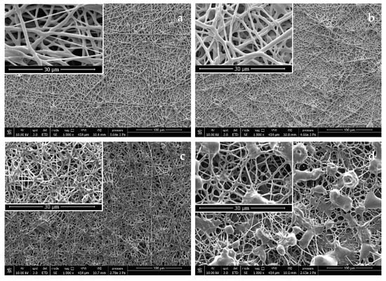 SEM micrographs of electrospun PHA fibers: (a,b) PHBHV (commercial), and (c,d) PHB/PHOHD (from Roy’s laboratory); (a,c) plain PHAs, and (b,d) PHAs incorporating OLE. Original magnification 1000× (scale bar 100 µm). Lens show details of the fibers (scale bar 30 µm).
